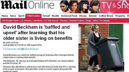 Hola amigos Para no creerlo Hay cosas que pueden resultar imposibles de creer, estas es una de ellas. Lynne Beckham es la hermana del famosísimo y multimillonario jugador inglés David Beckham pero a diferencia de el ella es pobre y vive gracias a la ayuda estatal que recibe de parte del gobierno. El referido medio agregó que la hermana del jugador de Los Ángeles Galaxy viene divorciándose y tiene una relación con Kevin Briggs, quien acaba de regresar a la cárcel por violar una orden de restricción que pesaba sobre él. Esta información ha tomado por sorpresa al astro del fútbol, pues casi siempre ha estado al tanto para que no le falte nada a cada uno de los integrantes de su familia.